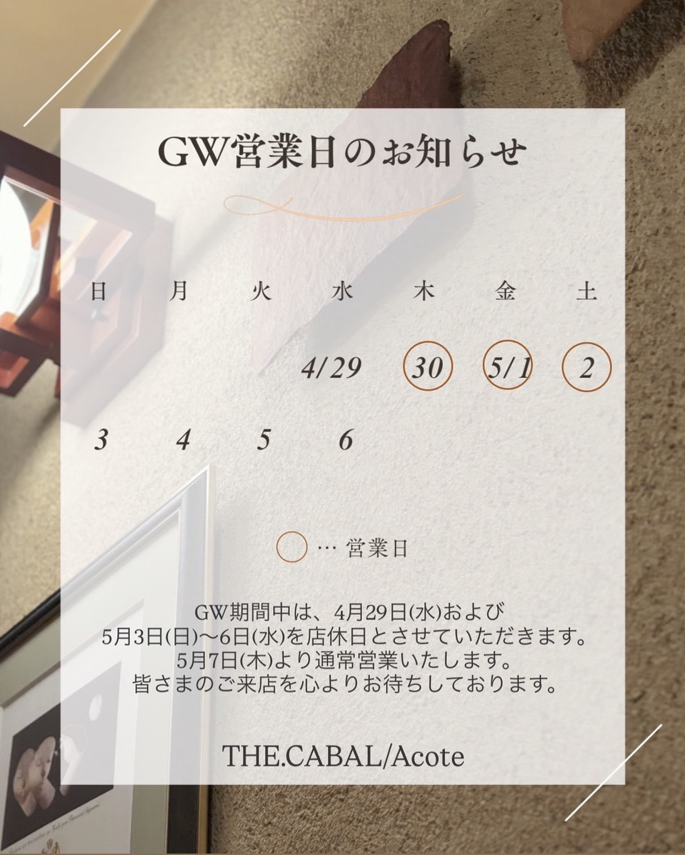 4月29日(水)、5月3日(日)〜6日(水)はお休みをいただきます。